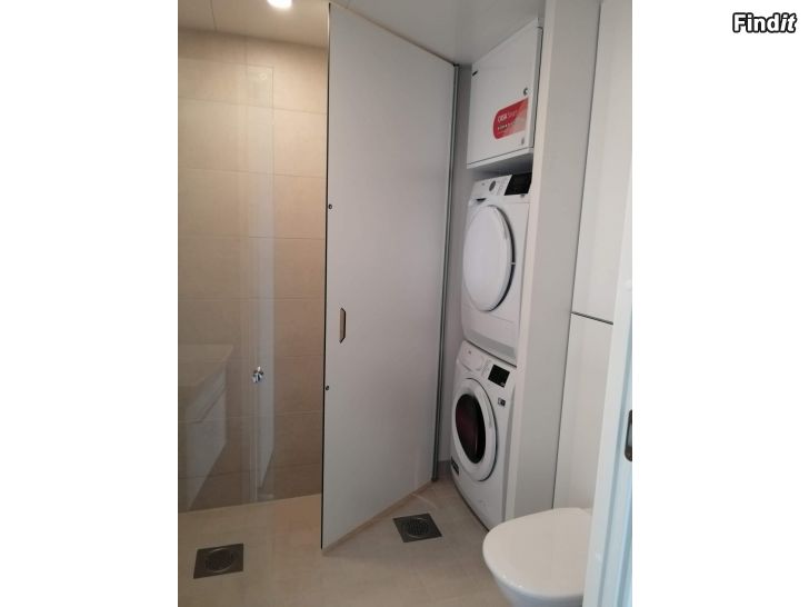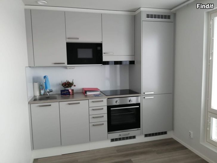 Moderni yksiö vuokrattavana Vaasassa 1.1.2026 alkaen. Asunnossa on integroidut astianpesukone, pyykinpesukone ja kuivausrumpu. Nopea internetyhteys sisältyy vuokraan.