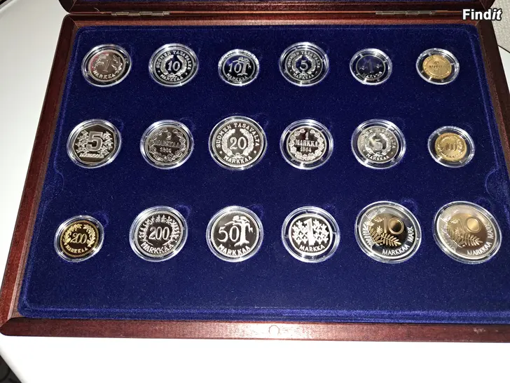 Monetan Suomen Rahapajan aikoinaan myymä Suoman markan historia -kokoelma. Kokoelmassa 18 kpl hopeista .925 kolikkoreplikaa, osa kullattuna. Markkareplikat ajalta 1864 - 2001. Replikat kauniissa puukotelossa. Monetan hinta ollut 1160€.