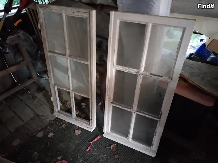 Kuvien mukaiset ikkunapokat.Toisen lasit ehjät,toisessa osa rikkinäisiä. Koko 46 cm x 100 cm. Halvalla pois , yht.15e