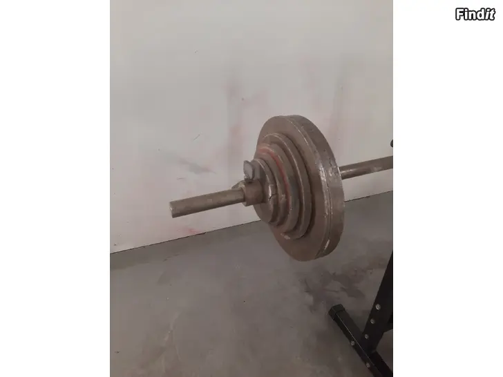 Säljes en pressbänk med skivstång och vikter. Ordentlig gammal finsktillverkad stång med ordentliga lås och vikter