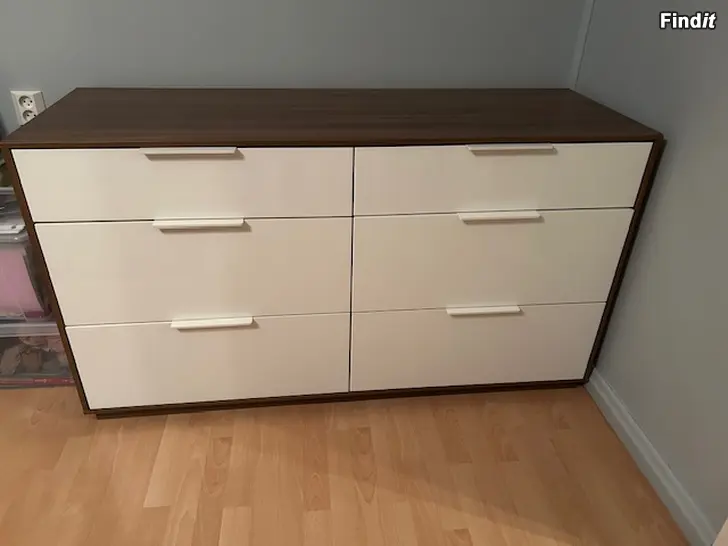 Ikean lipasto kuudella laatikolla. Pituus 146 cm, leveys 50 cm ja korkeus 80 cm. Tukeva ja siistikuntoinen.