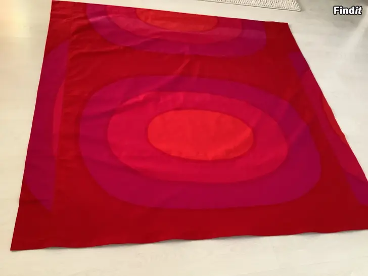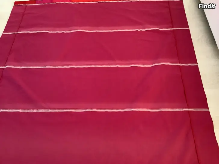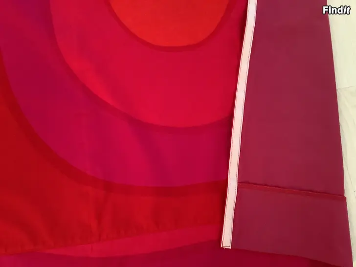 Marimekon kankaasta ompelijalla teetetty laskosverho. Tarranauha yläreunassa kiskoa varten. Laskosverhomekanismi ei mukana.
