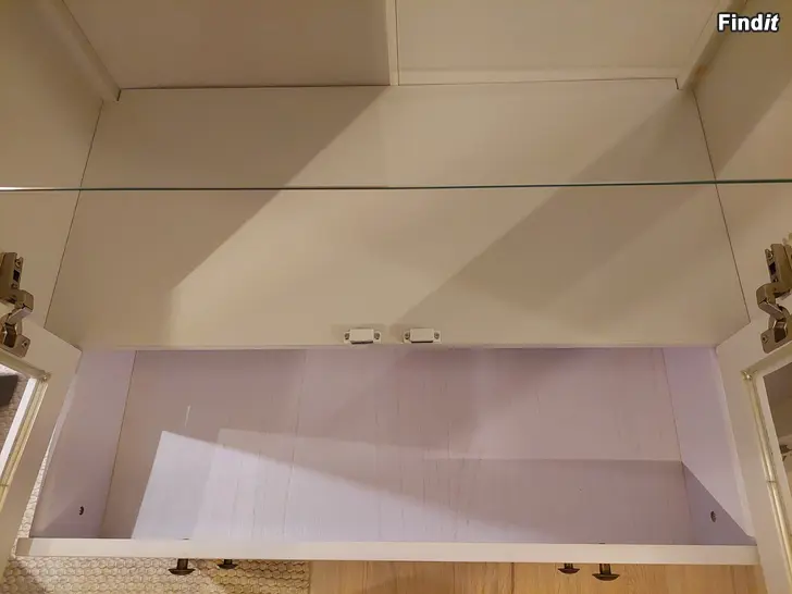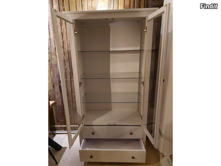 Valkoinen vitriinikaappi kolmella lasihyllyllä ja kahdella laatikolla. Mitat 180 cm x 96 cm x 45. Takaseinässä pieni halkeama ja jaloissa lemmikin raapimisjälkiä. Vain nouto.