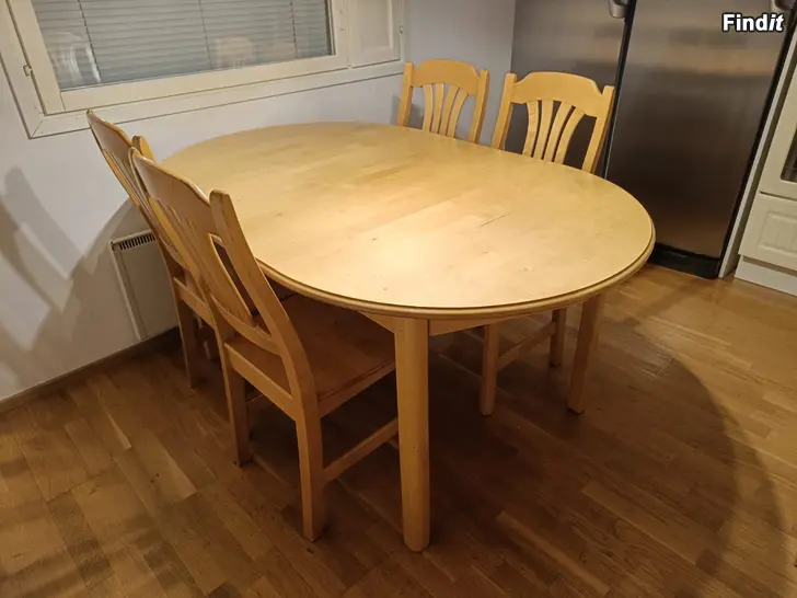 Bord och 6st stolar i ok skick säljes som obehövliga. Bordet fårs längre med mellanskiva vid behov, skivan har dock märken men döljs med t.ex. bordsduk