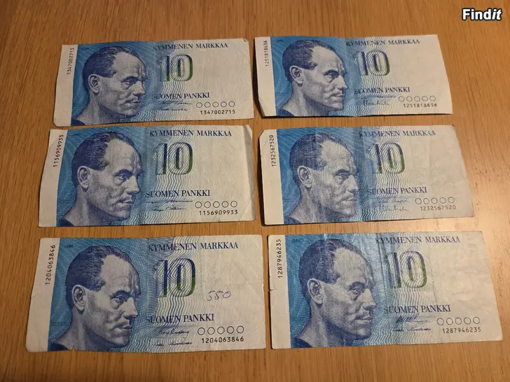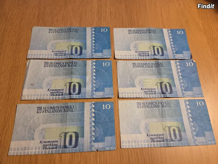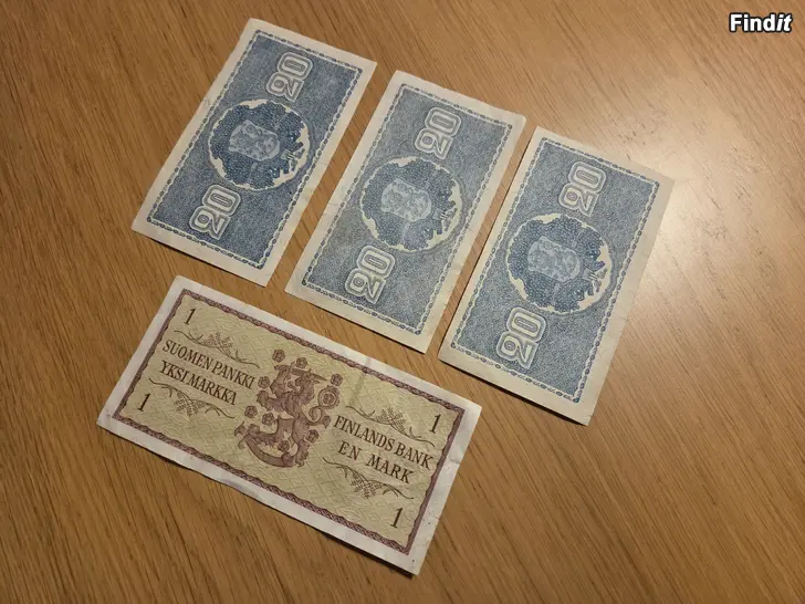Myyn vanhan ajan markan seteleitä. Kymmenen markkaa 1986 x6, kaksikymmentä markkaa 1945 x3, yksi markka ja 5 penniä kolikko. 10 markkaa, 20 markkaa. Suomen Pankki.