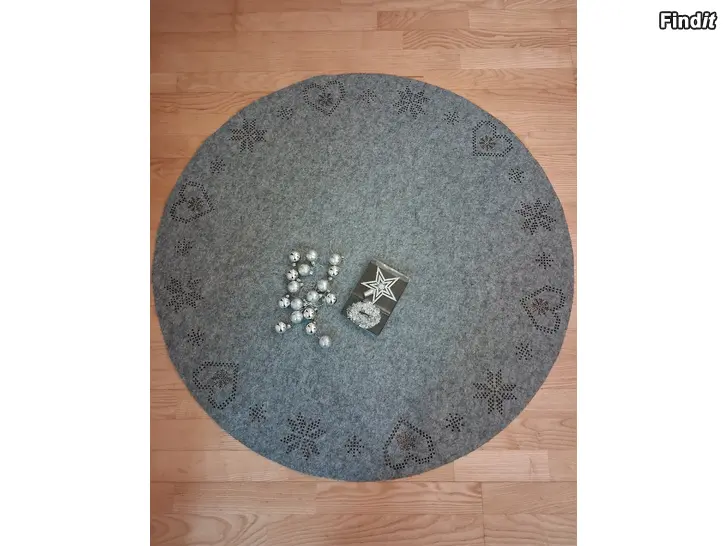 Säljes grå julgransmatta 100cm och julgranspynt till liten gran.
