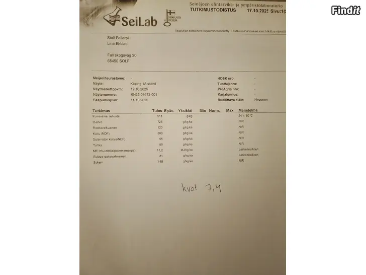 inplastade rundbalar analyserat hö. Hästbetesfröblandning, passar häst, men låg torrsubstans. 35€/ st. Solf.