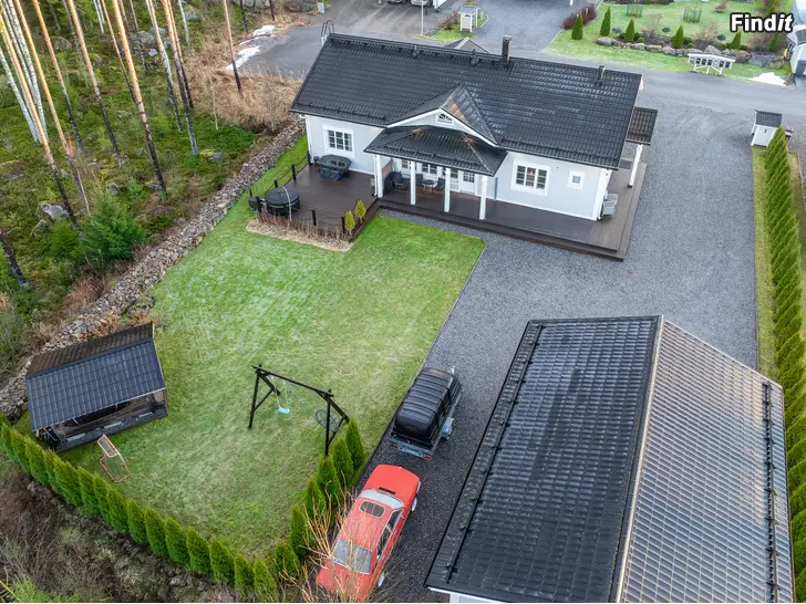 Iso talli, varasto sekä katos. Oma tontti 1207m2. Tontti rajoittuu metsään ja aurinkoa riittää ilta myöhään asti. Balju takana sekä iso terassi.