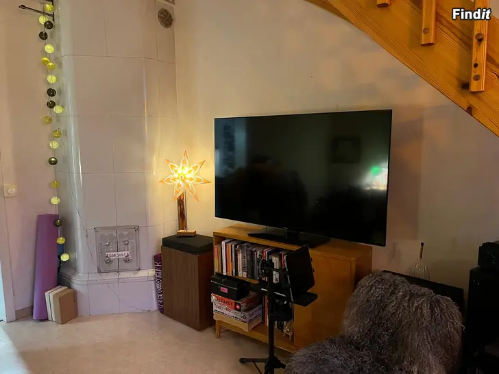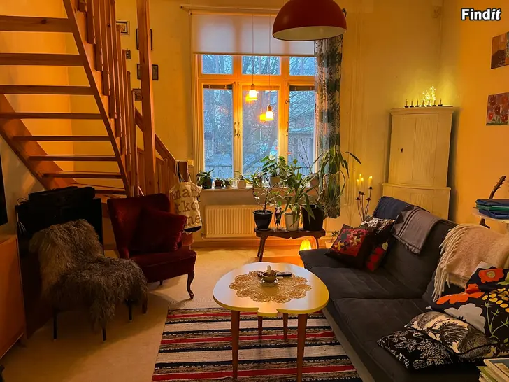 Lägenheten har 3 rum och kök 67m2 golvytan 72m2 i två våningar, 3,1m i takhöjd, 2m höga fönster, en 124år gammal förtjusande kakelugn i vardagsrummet och en takförsedd veranda utanför ytterdörren som går att ha som uterum under hela året.