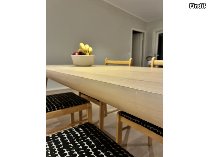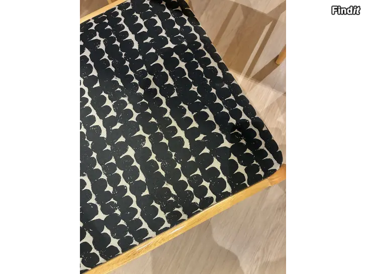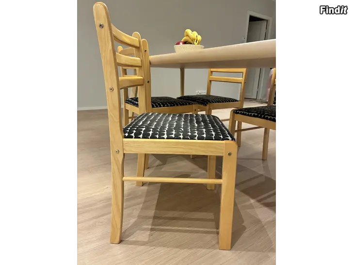 Myydään 4 hengen ruokailuryhmä muuton vuoksi. Pöydässä jonkin verran käytön jälkiä katso kuvat, yleisilme kuitenkin siisti. Tuolit verhoiltu itse uudelleen, kankaat pysyneet siistinä.