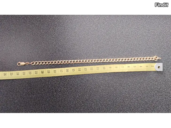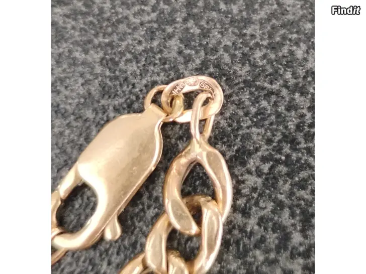 Kultainen 14k panssariranneketju. Pituus n. 24 cm, leveys 5 mm, paino 6g. Leima 585.