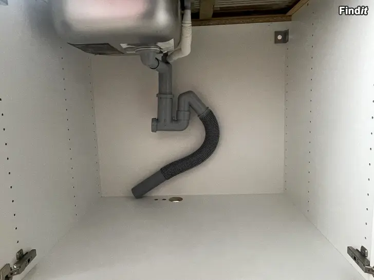 Tiskipöytä kaapilla, vesilukolla ja sekoittimella. Pöytä on ollut käyttämättömänä, eikä siihen ole kytketty vettä tai viemäriä. Mitat 80x60 cm. Vain yksi jalka, ei jalustaa eikä hyllyä kaapissa.