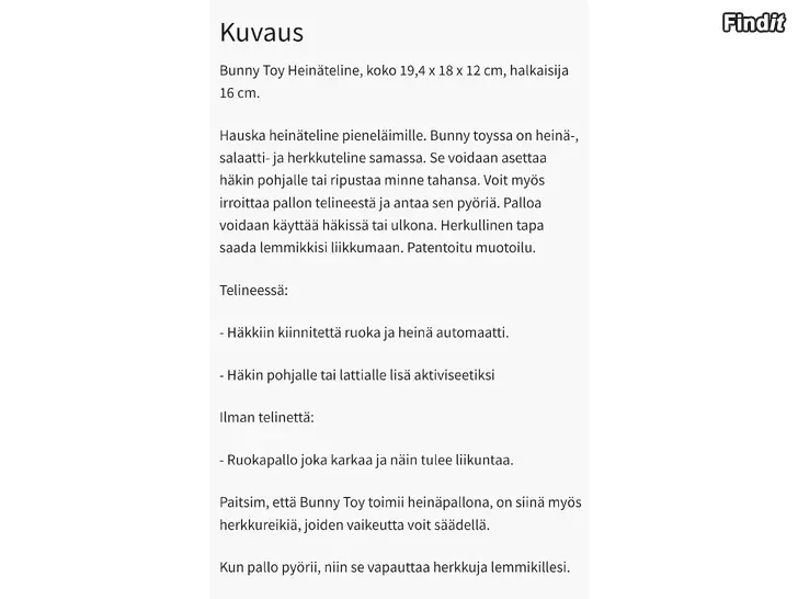 Findit ei vastaa ilmoitetusta tuotteesta tai ilmoituksen sisällöstä. SMS-viestien lähettäminen ilmoittajalle mainostarkoituksessa on kiellettyä. Ilmoittaja ei halua ilmoitus- ym. myyjien soittelevan. Jos sinulla on muuta kysyttävää tai mielipiteitä, ottakaa ystävällisesti yhteyttä asiakaspalveluumme.