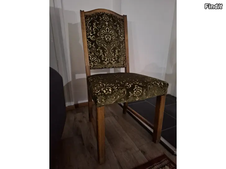 6 st stolar med grön blommig sammetstyg i bra skick. Bord medföljer där bör skivan slipas.