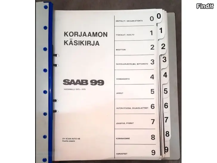 Alkuperäinen Oy Scan-Auto Ab:n vuonna 1976 julkaisema tehtaan oma SAAB 99 täydellinen korjaamon käsikirja. Tämä oli tarkoitettu nimenomaan vain valituille korjaamoille.