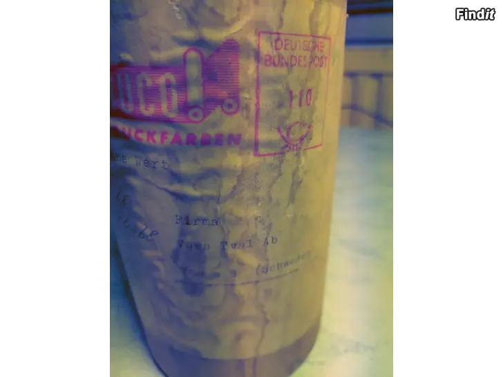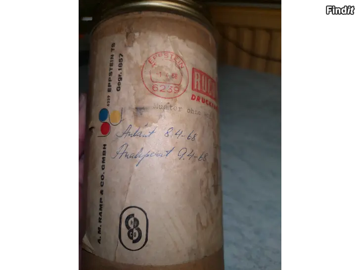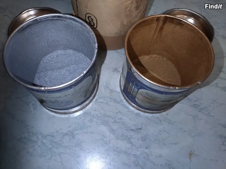 Från april 1968 i original postpaket stämplat 1.4.1968 i Eppstein Tyskland. Innehåller 2 småplåtburkar med pulver. Silver brons ca 2 matskedar, guld brons ca en tesked.Pulverform . Obs filateli värdet. Adressat är Vasa Tvål , felaktigt lokaliserat till Sverige.