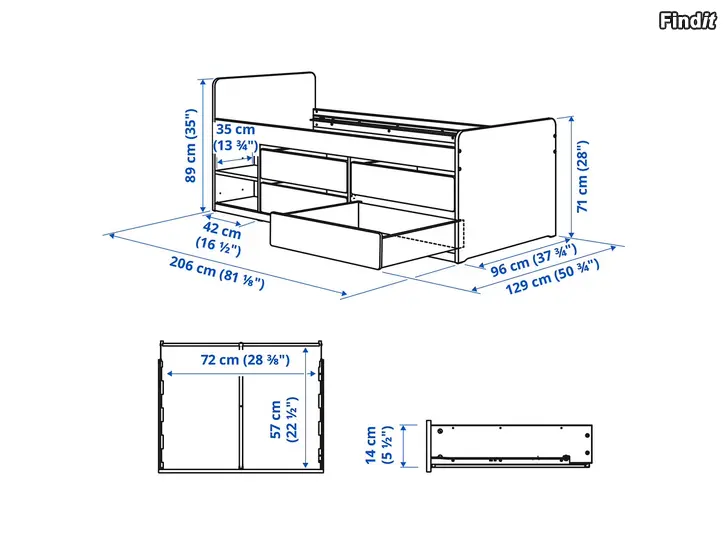 SLÄKT-sänky 90 cm, neljä laatikkoa sängyn alla.
