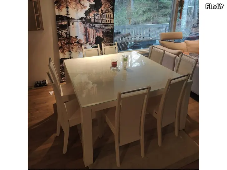 Siisti ja massiivi puuta lasikannelle oleva pöytä. 8kpl tuolia. Laatu setti