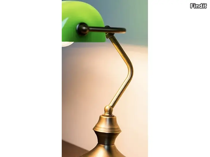 Söker bordslampa, grön skärm i glas, krokig arm, rund fot.