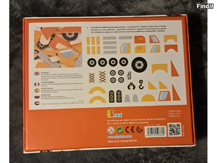 Kuvan mukainen Viga Työkoneet naulaussetti, kaikki osat tallessa 45 puista osaa, puinen vasara, korkkialusta, nauloja sekä kuvallisia mallikortteja.