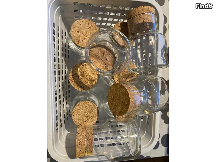 Lasiset säilytyspurkki, kansi luonnonkorkkia, korkeus 8 cm + korkki. Nouto Pietarsaaren keskustasta.