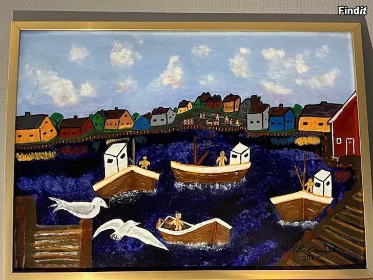 Gammaldags fiskeby. Oljemålning på mineralfiberduk. Bredd 73 cm. Höjd 53 cm. Peter Glennfalk nr 39. Frakt tillkommer