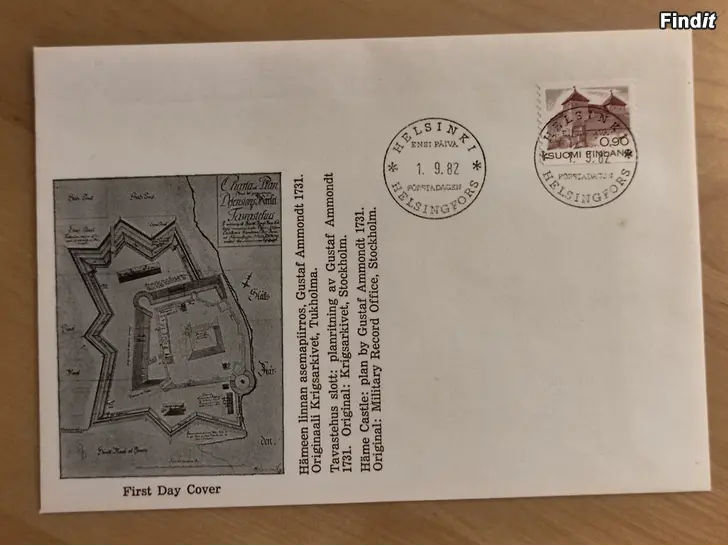 Ensipäiväkuori, Hämeen Linnan asemapiirros. 1.9. 1982. Uusi/uudenveroinen