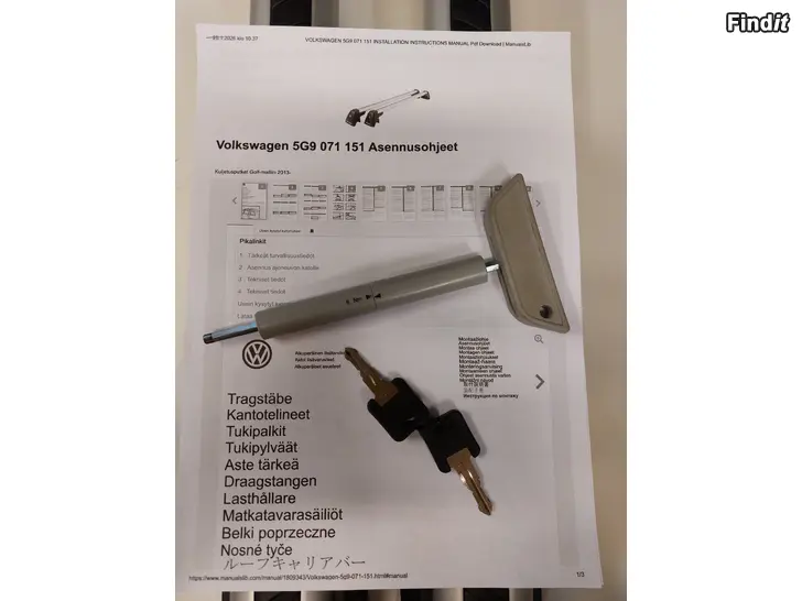 Volkkarin alkuperäiset lukittavat 2 kpl avaimia, kiristystyökalu sekä asennusohjeet eli kaikki osat tallella ja ehjiä