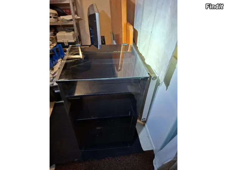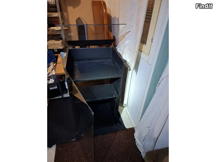 Hyväkuntoinen, pyörät alla, lasiovi, avattava lasinen yläkansi, sisällä yksi hylly ja tilaa levyille, mitat: k90cm, s45cm, l 48cm