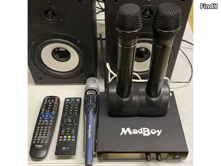 - langattomat MADBOY U-TUBE 20R mikrofonit https://www.verkkokauppa.com/fi/product/310367/MadBoy-U-Tube-20R-langaton-karaokemikrofonipari. Mikrofonien AA-akut eivät ole parhaassa kunnossa, mutta mikrofonit toimivat myös tavallisilla AA-paristoilla
