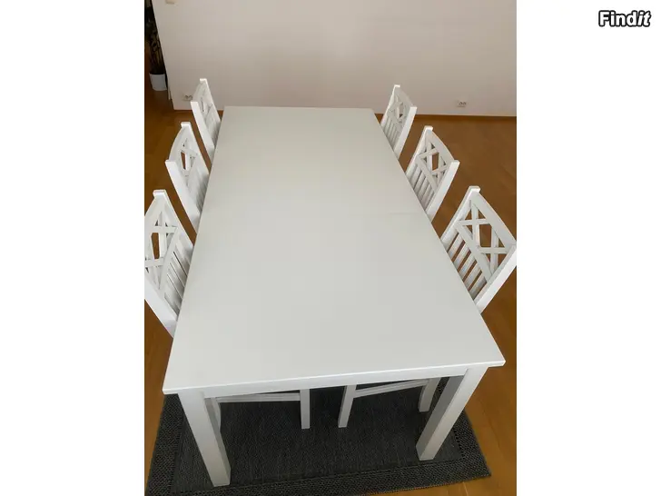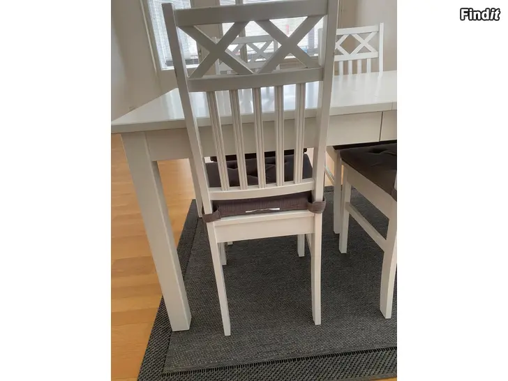 Säljes matbord för 6 personer/4 personer utan förlängningsskiva. 6 stolar finns med stolsdynor från IKEA till samtliga.