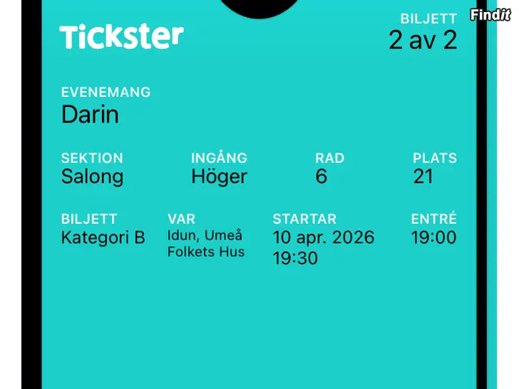 Säljes två Darin biljetter, på Idun i Umeå. Den 10.4.2026. Priset är för båda biljetterna.