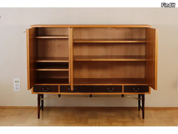 Skänken är i utmärkt skick och välvårdad. Utrustad med lådor och justerbara hyllplan. Nyckeln finns kvar. Svarta lådor och böjd mässingstång i nedre delen av möbeln.