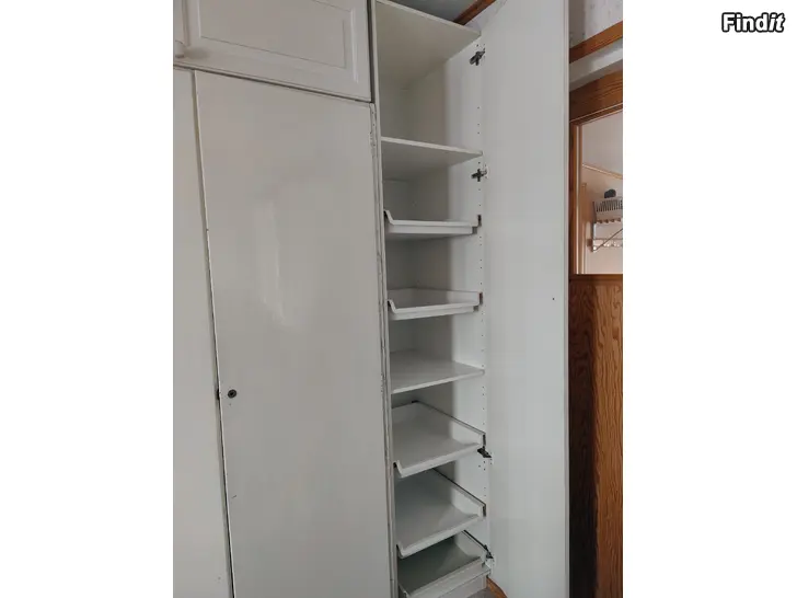 Högskåp med utdragbara hyllor. Höjd 225cm + 10cm sockel, bredd 50cm och djup 60cm, 20€.