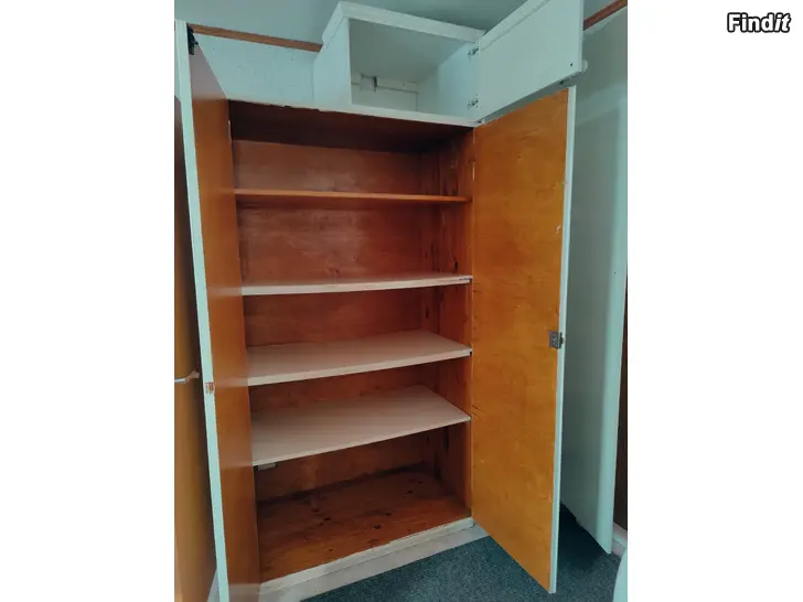 Gammalt trä högskåp med lack flagnor. Bredd 110cm, höjd 200cm och djup 60cm. Finns lås och nycklar. Lackad insida med målade hyllor, 30€.