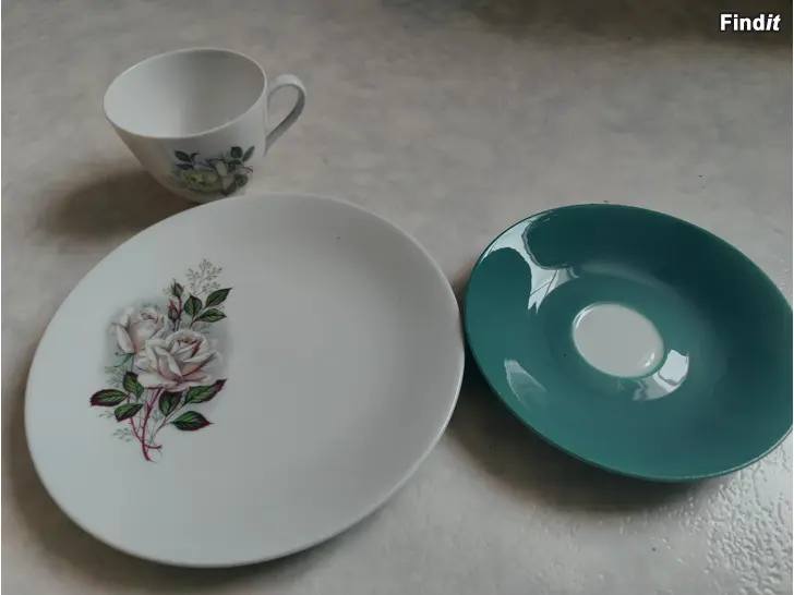 Finns 12 assietter, 11 koppar, finns en liknande kopp som kan följa med, och 12 kaffefat.