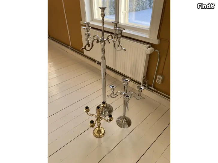 3 ljusstakar, höjden på dem är 106cm, 54cm och 35cm. Pris för alla tre är 30€