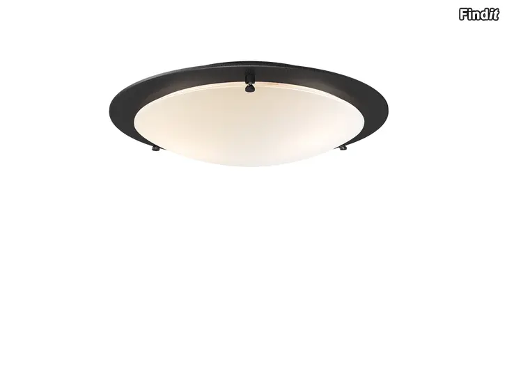 Pelkistetty kattoplafondi, jonka runko on metallia ja kupu opaalivalkoista lasia.