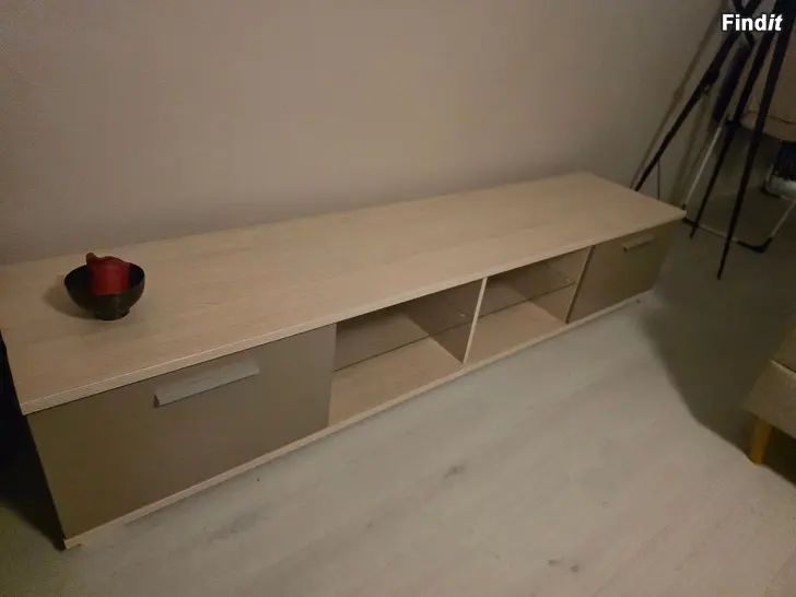 Kaunis beigellä ovilla ja lasihyllyillä oleva TV Taso. Koivupinta.