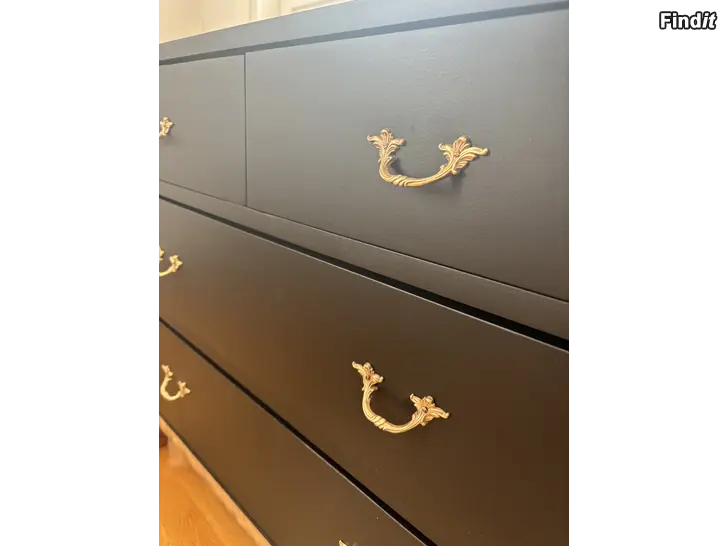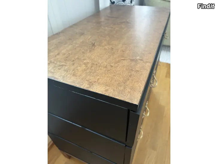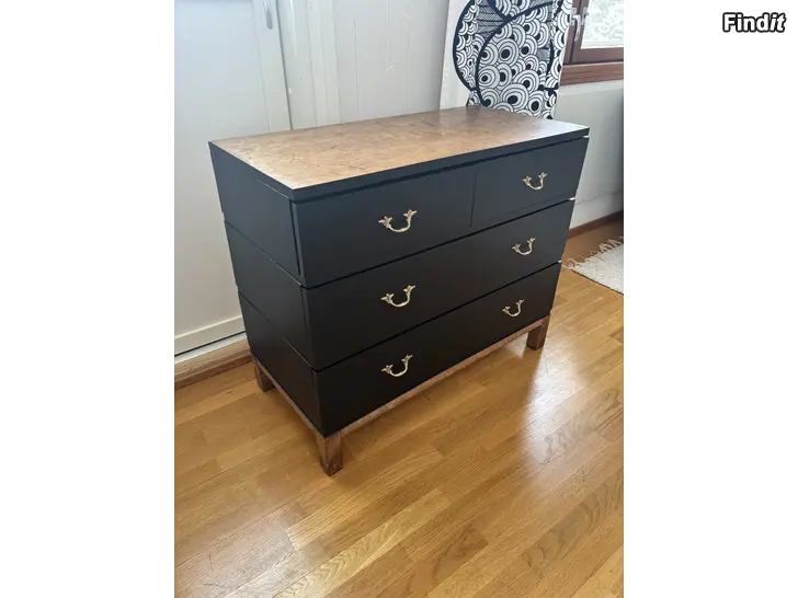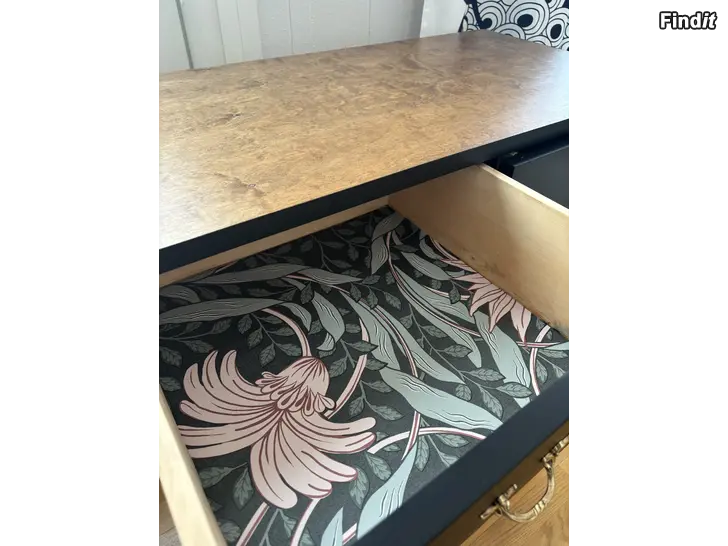 Myydään kunnostettu puinen nelilaatikkoinen lipasto, jossa musta runko ja puunsävyinen kansi sekä jalat. on koristeelliset metallivetimet. Laatikoiden sisäpohjat on päällystetty kuviollisella paperilla. Sopii esimerkiksi makuuhuoneeseen, olohuoneeseen tai eteiseen säilytyskalusteeksi.