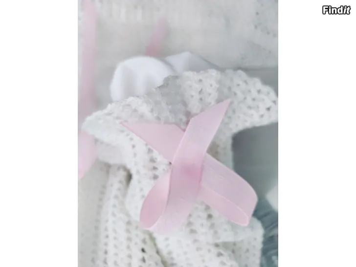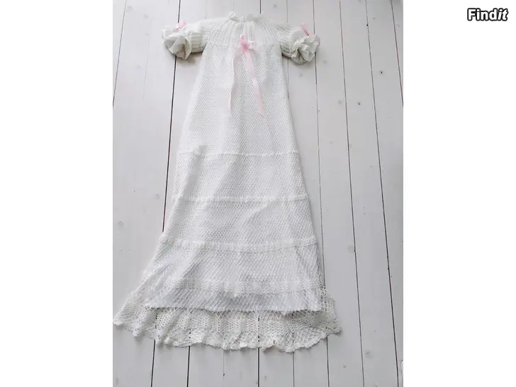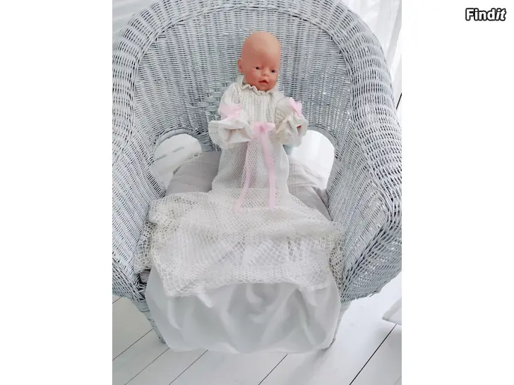 Hieno,käsin virkattu kastemekko puuvillaisella alushameella.Mukana siniset ja vaaleanpunaiset nauhat,nepparikiinnityksellä.Kuvassa kastemekko Baby Bornin päälle puettuna.