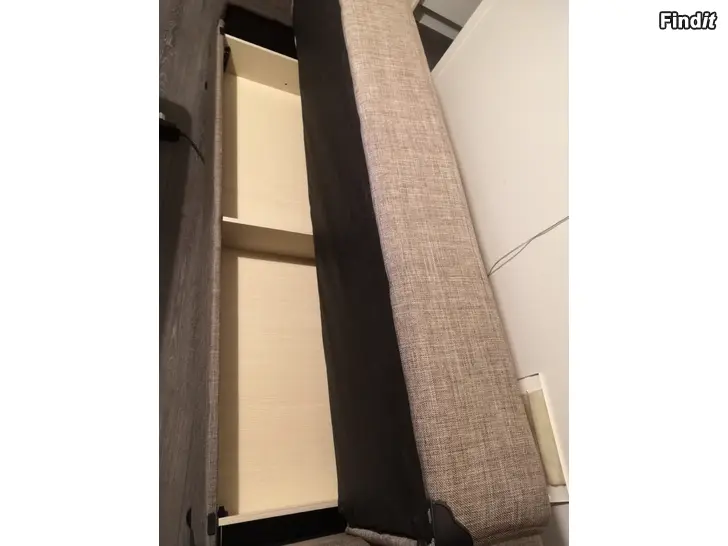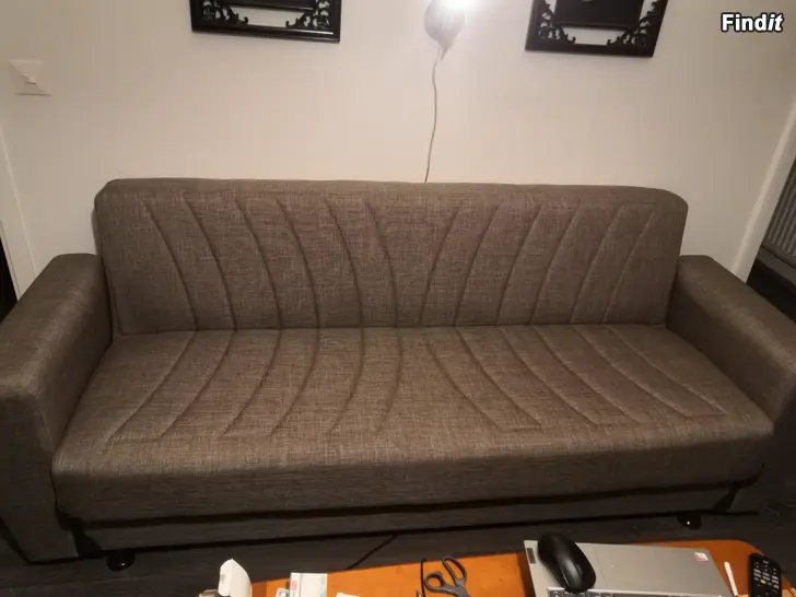 Lähes uusi vuodesohva kätevällä mekanismilla harmaa ruskehtava.Säilytystilaa vuodevaatteille tms.Ei ole käytössä ollut meillä ja päiväpeitto ollut suojana kokoajan, n.3.kk.tta.Kuittikin on