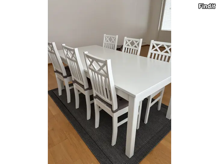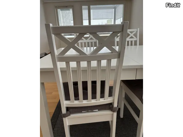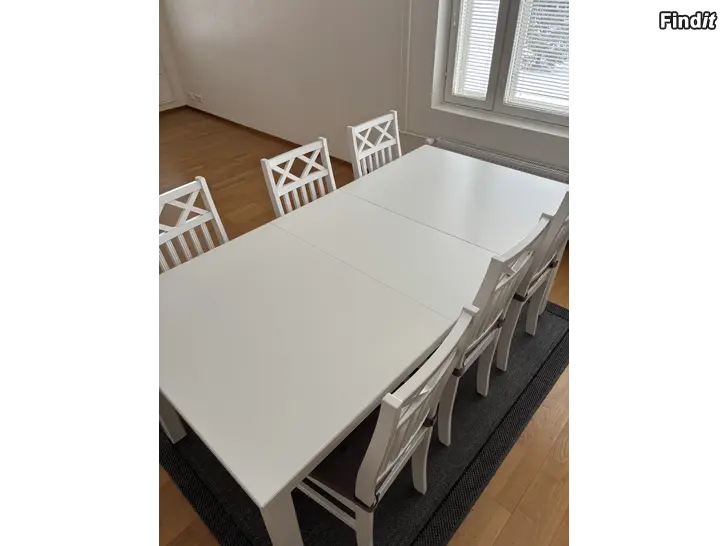 Vitt matbord för 4 personer med förlängningsskiva så bordet passar för 6 personer. Utan skiva 140 cm, utdraget 180 cm. Bra skick!