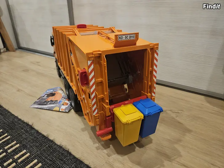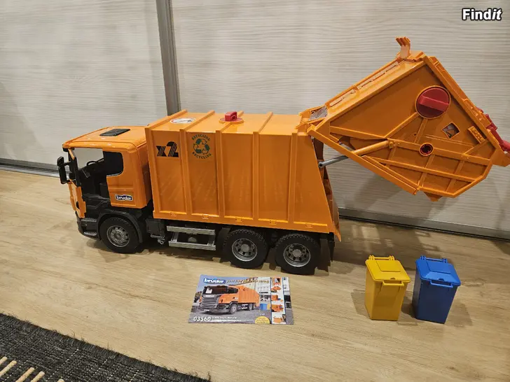 Fin Bruder Scania leksaks sopbil med många detaljer, 2 st sopkärl.
