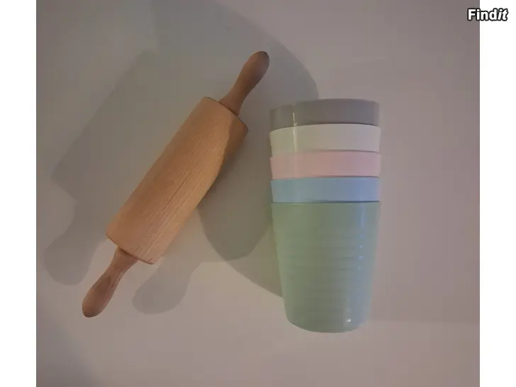 Säljes magneter, Ikea plastmuggar och liten träkavel.