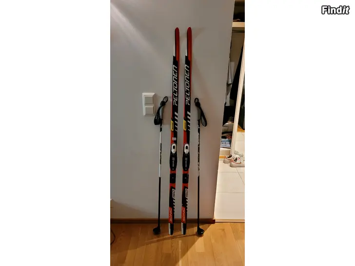 Peltonen Sonic lasten sukset 150cm ja Ficscher xultimate sauvat 105cm.