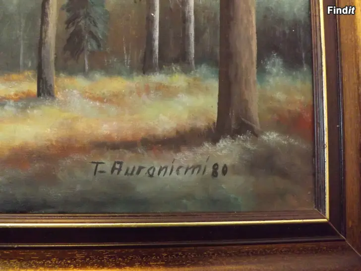 Öljyvärityö kankaalle, signeerattu ja päivätty 1980. Töysäläisen taiteilija Toivo Auraniemen maalaus nimeltään Metsämaisema. Taulun koko 133x65 cm.