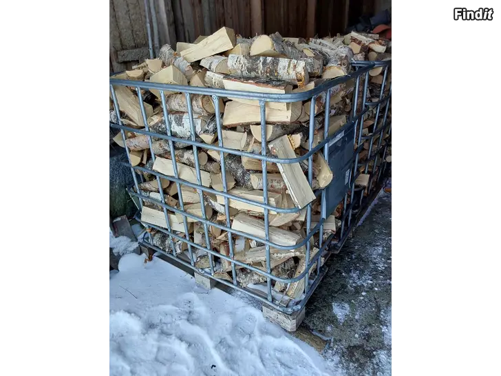 Ca 1,2 m3 kluven björkved, torkad under tak 80€.Korgen ingår inte i priset.