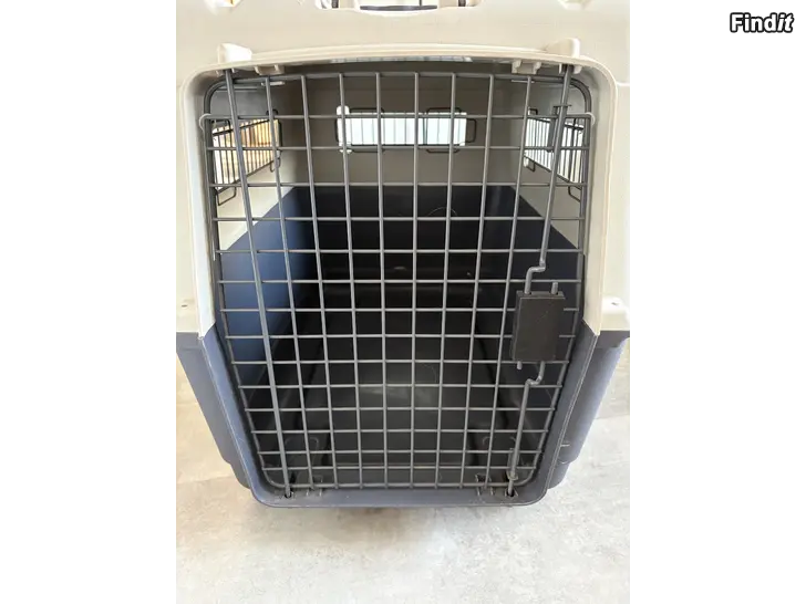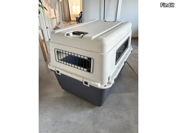 Använd en gång för flygresa med hund, har stått i förråd sedan dess. Löstagbara hjul och alla skruvar inkluderat. Ägarens namn och telefonnummer har skrivits med tusch och syns svagt ännu, men går att täcka över.