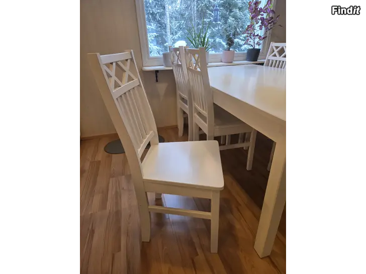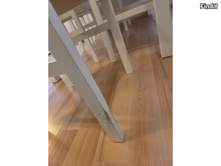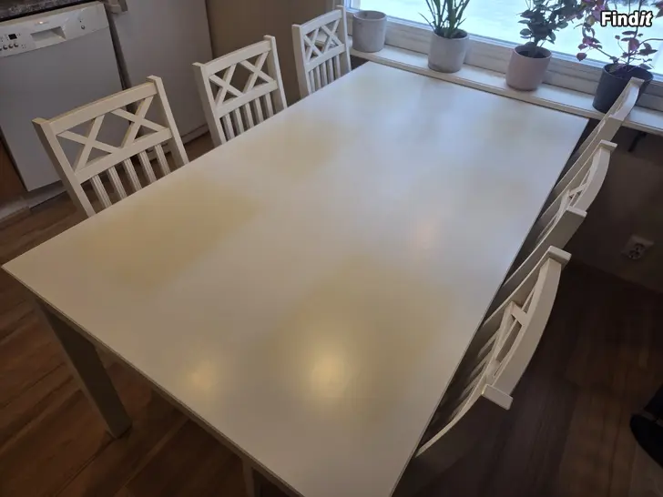 Säljes vitt, stabilt köksbord med 6 stolar. Bordet har gula fläckar av bordstabletter men är annars i gott skick. Ena stolen är lite skadad på benen men annars är de hela och stabila.